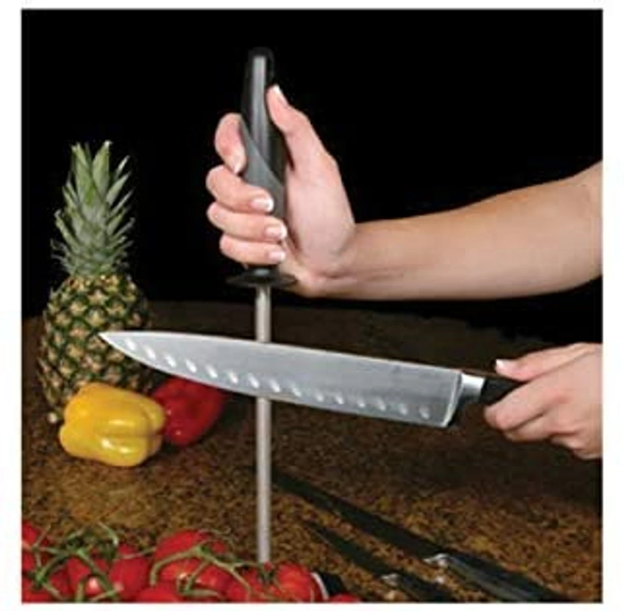The AccuSharp® Sharpening Steel realigns the blade’s edge keeping all your household knives properly honed. The steel surface quickly returns the edge of a good blade in around 10 strokes.