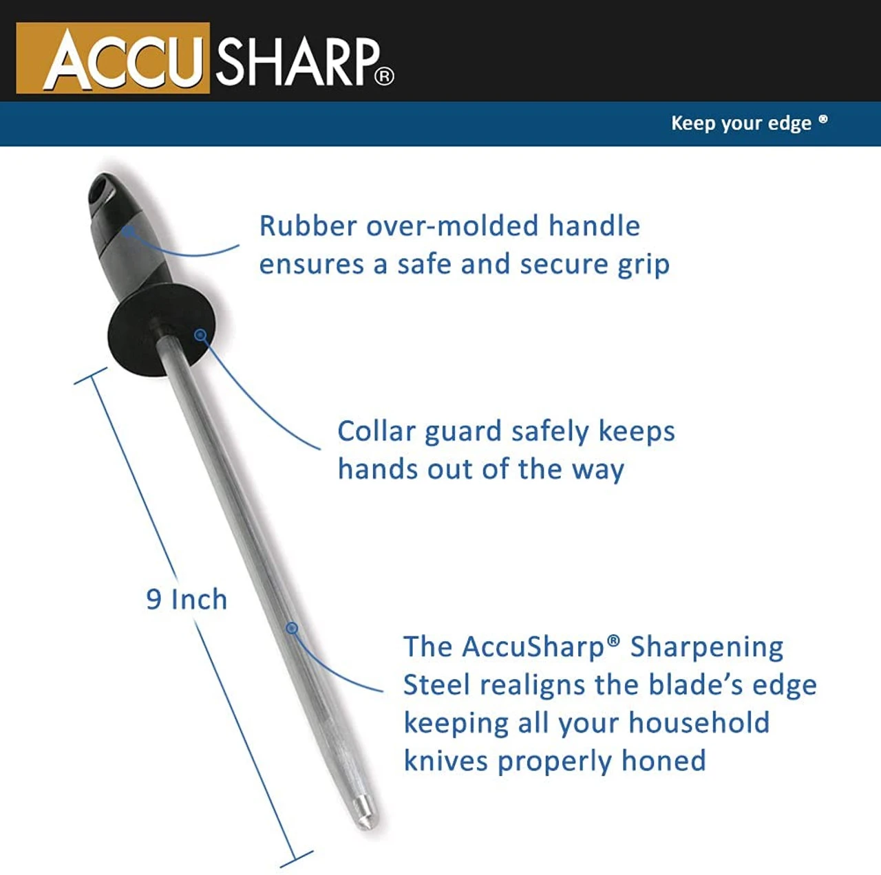 The rubber over-molded handle ensures a safe and secure grip, and the collar guard safely keeps hands out of the way. The AccuSharp® Sharpening Steel is available in 9-inch length.