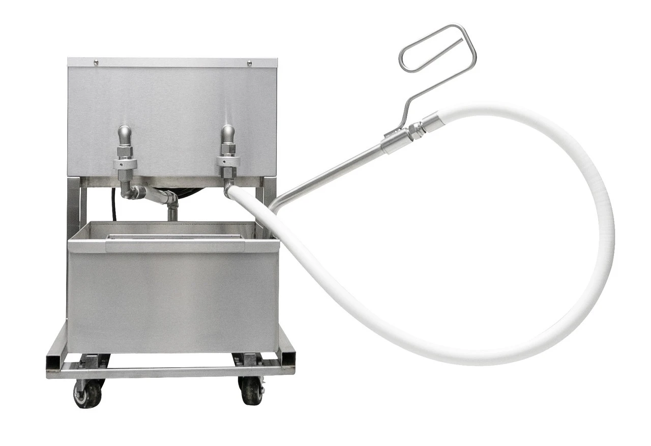 With a robust welded steel frame mounted on swivel casters, this filter system is highly portable, allowing it to be easily moved and positioned under the fryer drain for effective use. It accommodates 50 lb capacities, providing versatility for your frying operations. The low profile design enhances the usability by fitting neatly under the fryer, maximizing kitchen space and accessibility.