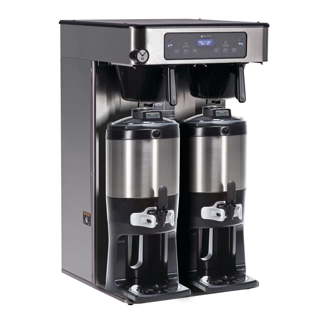 The ICB Twin Tall Infusion Series coffee brewer delivers twice the brew capacity, from a single platform. With over 23 inches of clearance under the brew funnel, the brewer is designed to easily brew into 1.5 gallon TF servers. The Peak Extraction spray