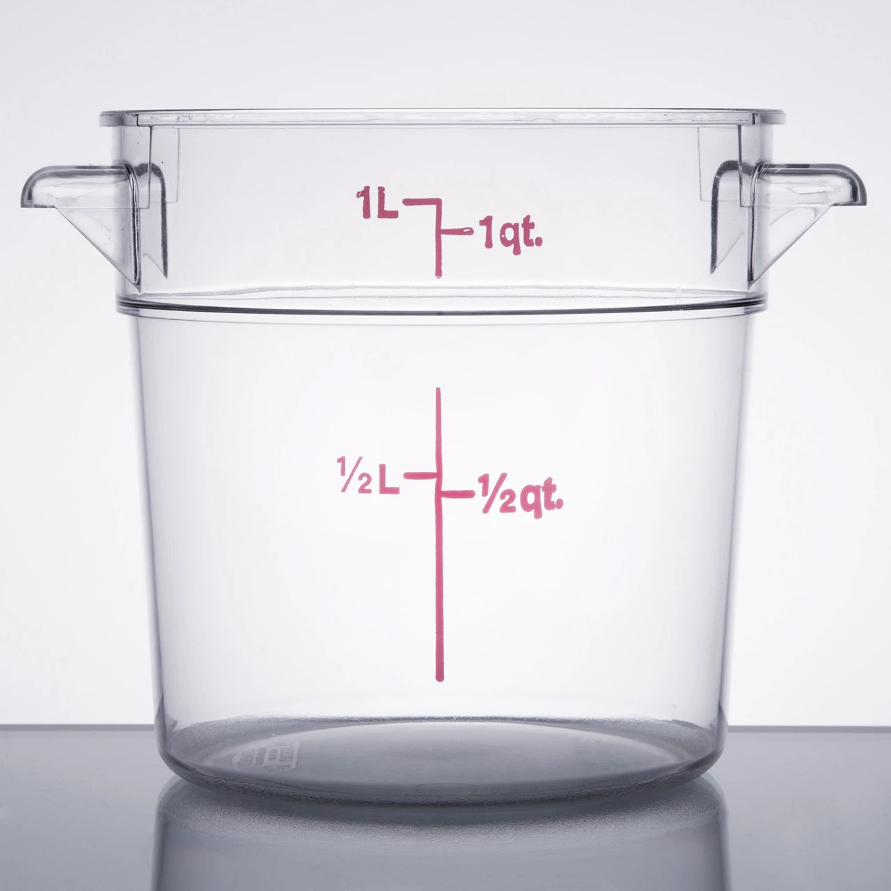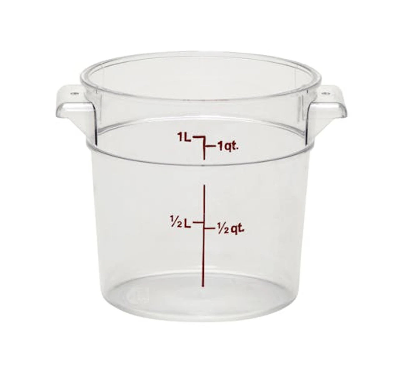 This Cambro Camwear 1 qt. round food storage container is made of crystal clear, virtually unbreakable polycarbonate that won’t be stained or harmed by food acids, oils, or alcohol. Complete with easy to read imprinted graduations on the outside, it’s simple to see how much is in each container. After washing, place it upside down to dry. The molded-in holes in the handles make sure they don’t retain water.