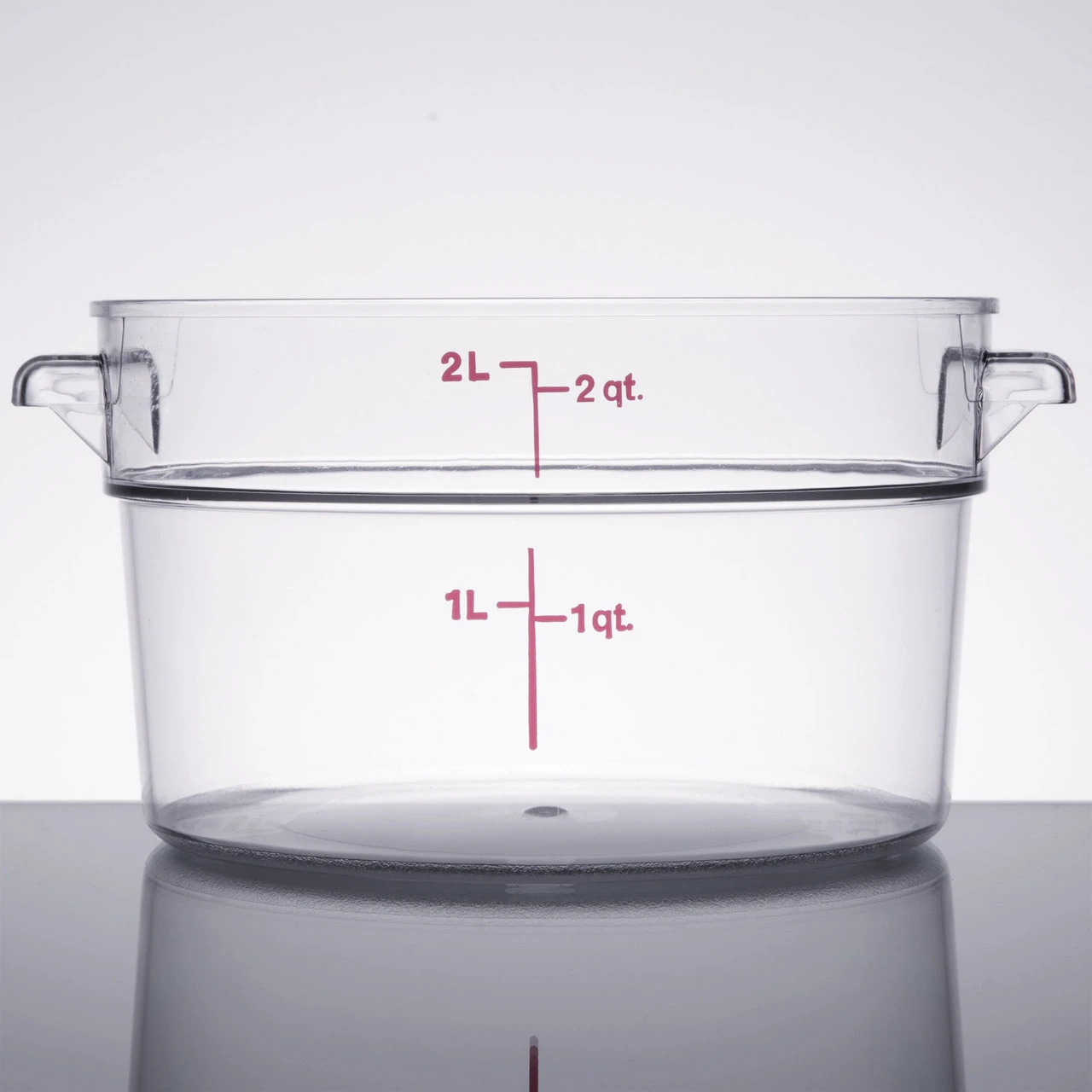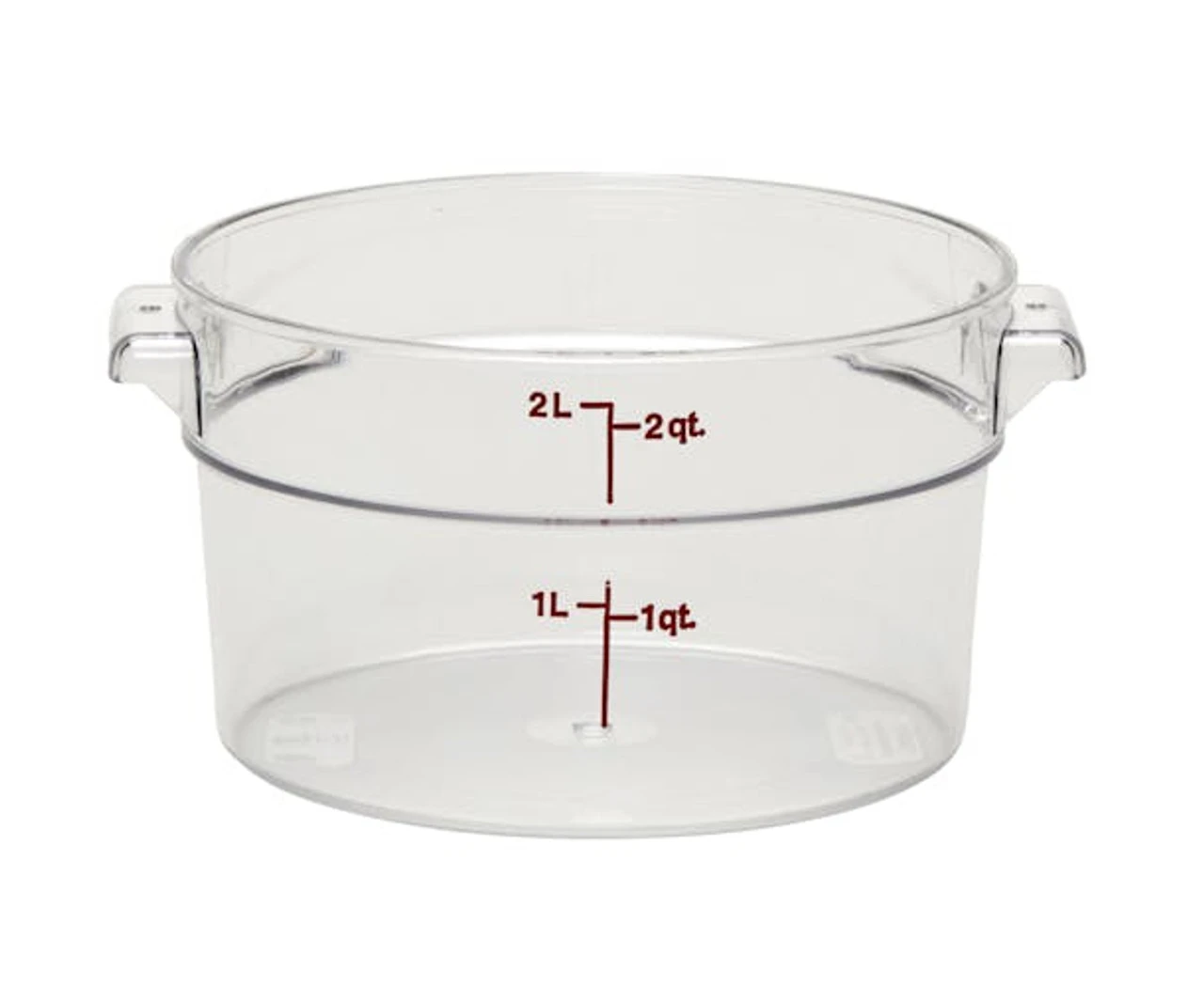 This Cambro RFSCW2135 Camwear 2 qt. round food storage container is made of crystal clear, virtually unbreakable polycarbonate that won’t be stained or harmed by food acids, oils, or alcohol. Complete with easy to read imprinted graduations on the outside, it’s simple to see how much is in each container. After washing, place it upside down to dry. The molded-in holes in the handles make sure they don’t retain water.