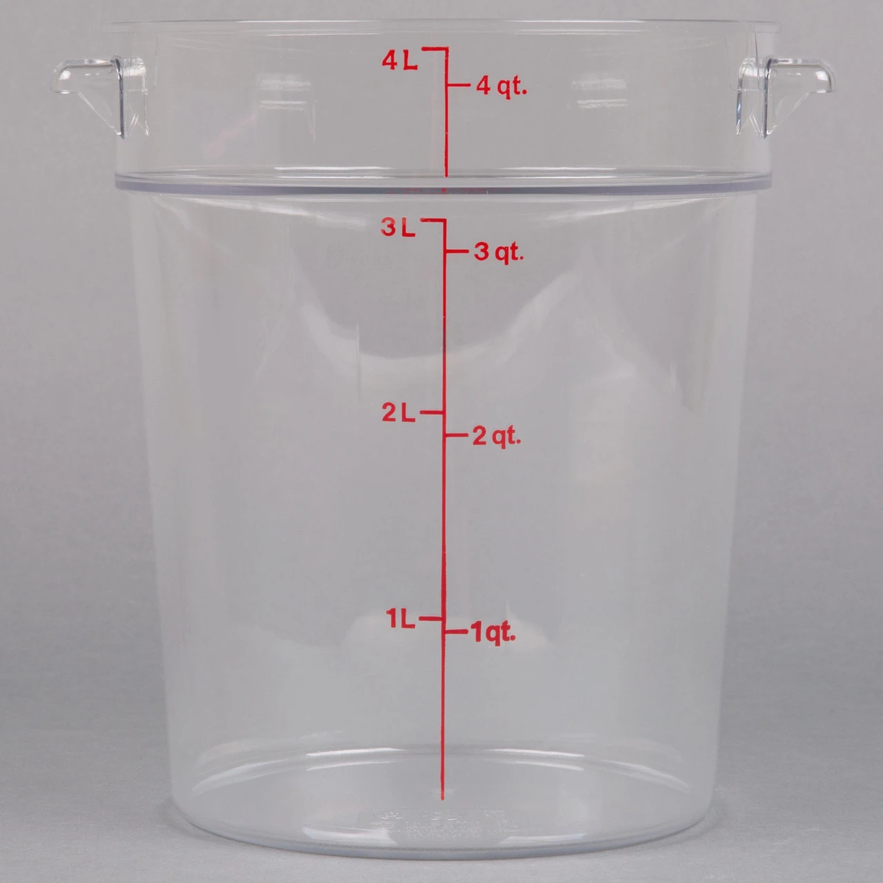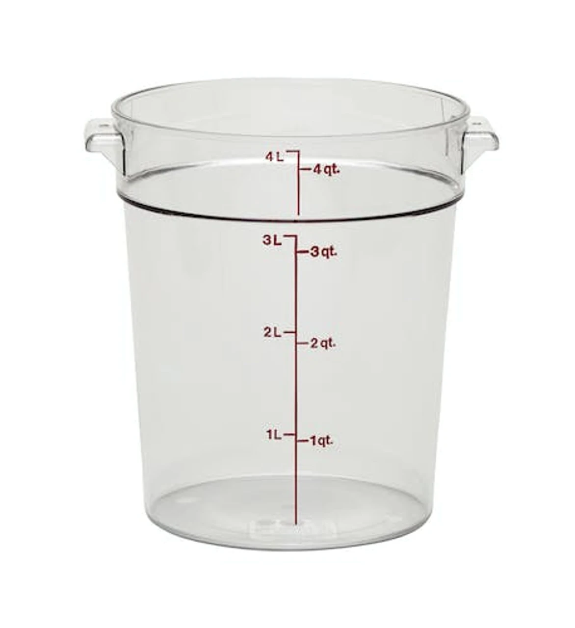 This Cambro RFSCW4135 Camwear 4 qt. round food storage container is made of crystal clear, virtually unbreakable polycarbonate that won’t be stained or harmed by food acids, oils, or alcohol. Complete with easy to read imprinted graduations on the outside, it’s simple to see how much is in each container. After washing, place it upside down to dry. The molded-in holes in the handles make sure they don’t retain water.