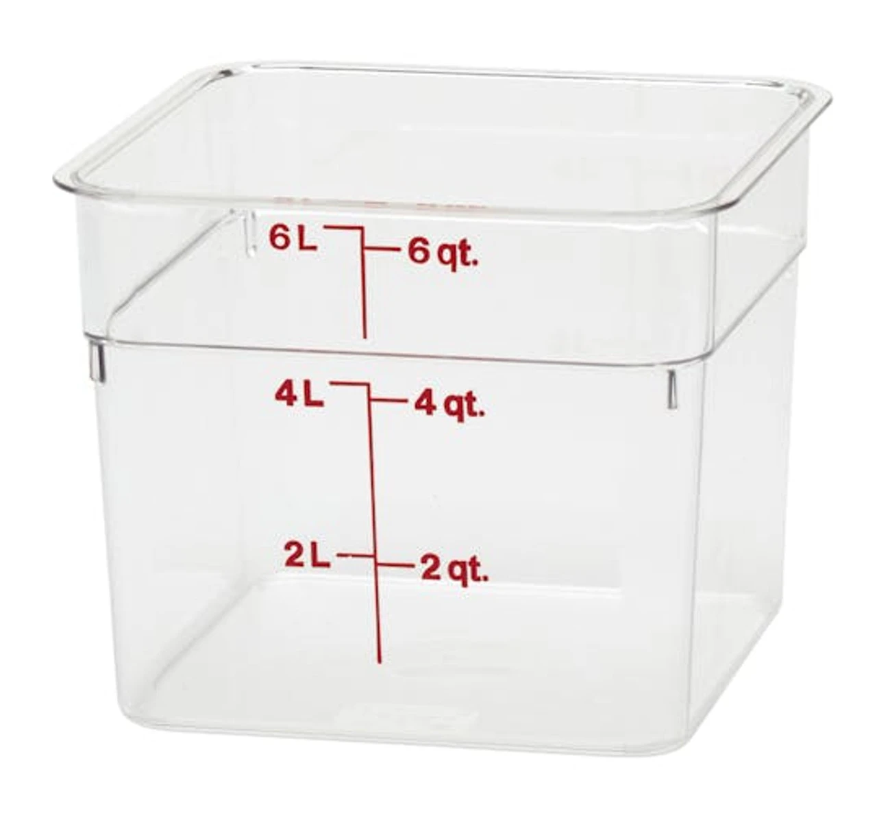 Safely store your products with this Cambro 6 qt. square food storage container! This food storage container is made of impact resistant solid white plastic that won’t be stained or harmed by food acids, oils, and alcohol. Thanks to its square shape, this container can be conveniently packed onto shelves without wasting space, while its easy-to-read winter rose-colored gradations allow you to manage your inventory at a glance.