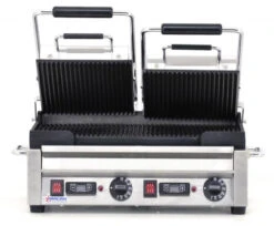 Omcan – 10″ X 18″ Double Panini Grill With Top And Bottom Grooved Grill Surface With Timer – 42914
