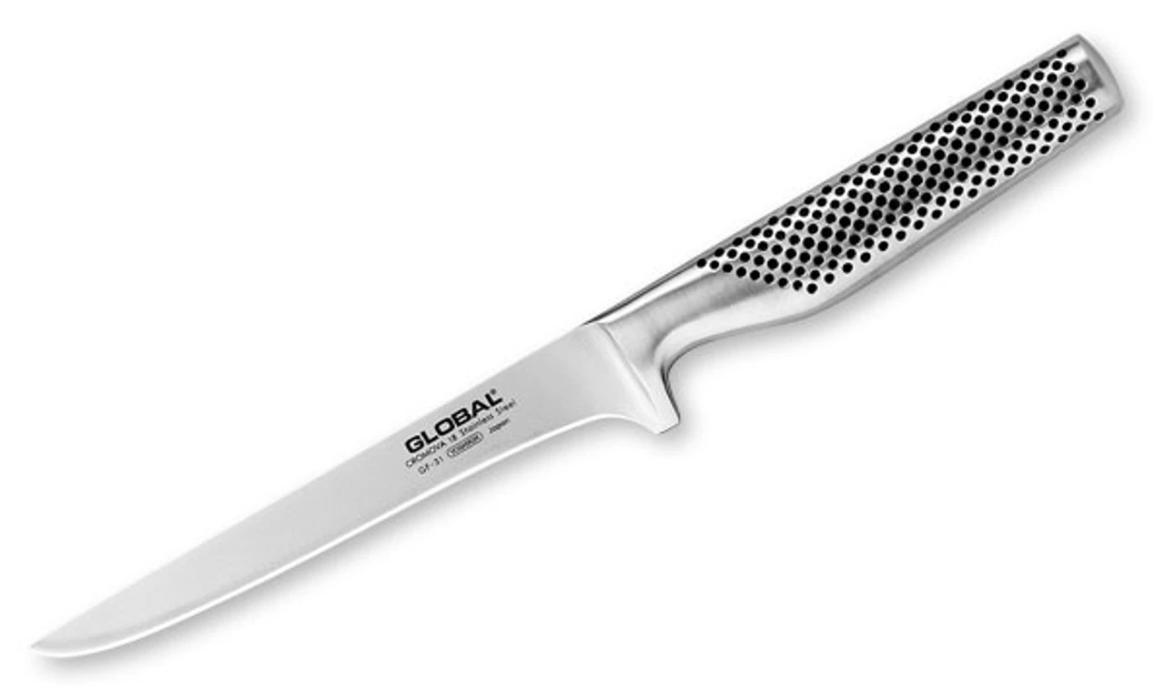 This 6’’ Heavyweight Boning Knife from Global is an excellent tool for working around difficult bones in a variety of meats. Deboning products before they are cooked is one of the trickiest jobs in the kitchen, but you will find that the task suddenly gets a great deal easier when you own this small knife from Global. This respected Japanese brand has used their well-known CROMOVA stainless steel to create the blade of this knife, and the handle is hollowed to lead to perfect balance from tip to tail. With just a little practice to get comfortable, this knife will become one of your favorite pieces of kitchen equipment.