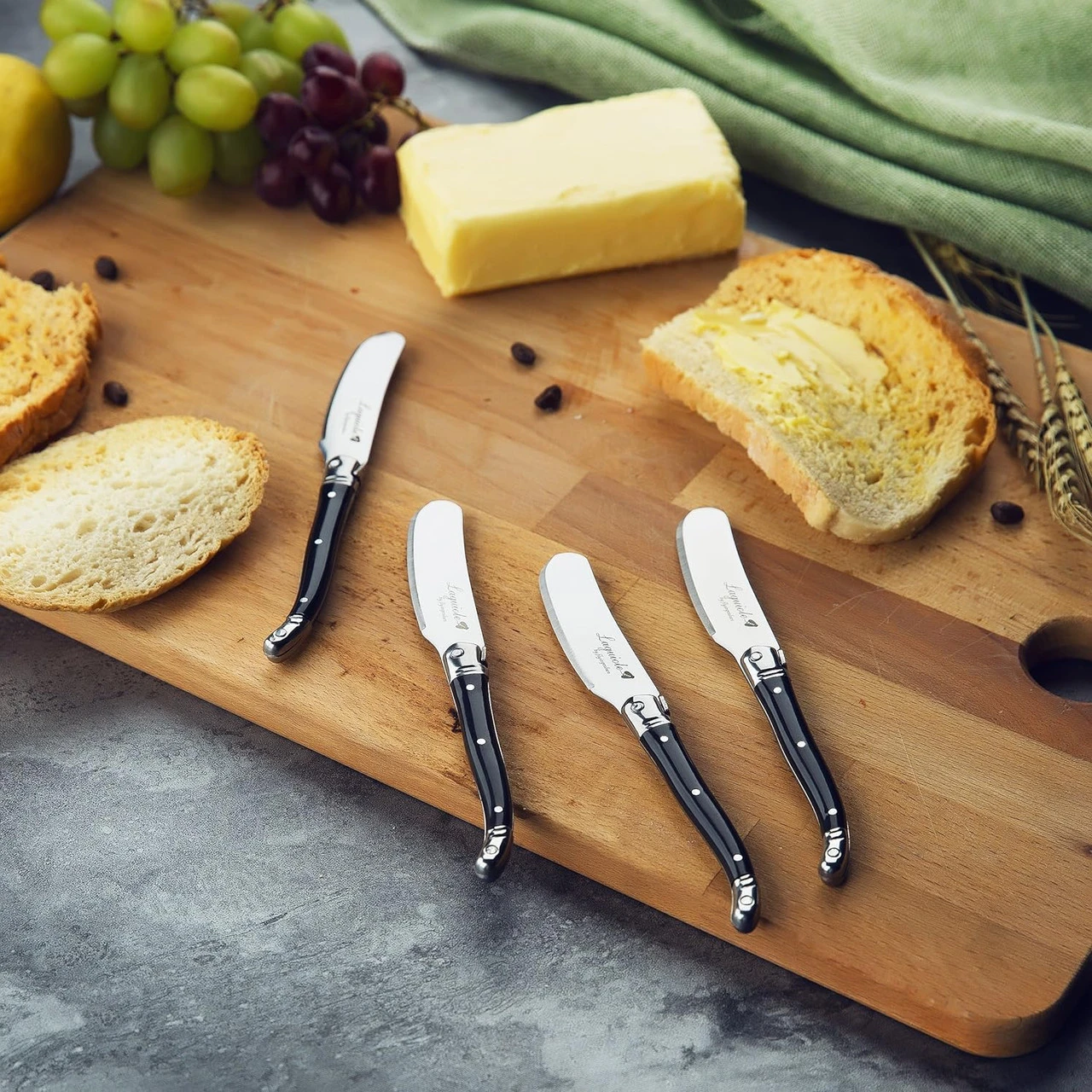 - Set of four identical butter / cheese spreaders with ends and high grade stainless steel heads, black colors ABS plastic handle.