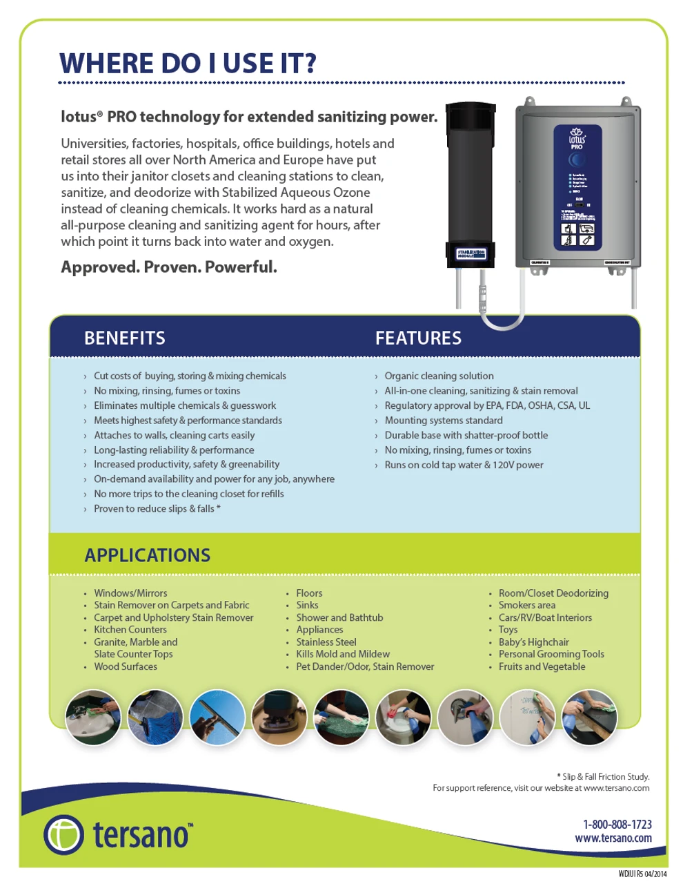 SSS Lotus PRO High Capacity with Series I Stabilization Module: are the ideal match to create an effective but safe and natural cleaning system for your business. Using the lotus® PRO technology, ordinary tap water mixed with oxygen transforms into aqueous ozone which works faster and more effectively than a chemical cleaning solution. As a natural all-purpose cleaning and sanitizing agent, lotus® PRO works for hours, after which point it converts back into water and oxygen. The lotus® PRO system creates an effective cleaning solution for all applications in any industry.