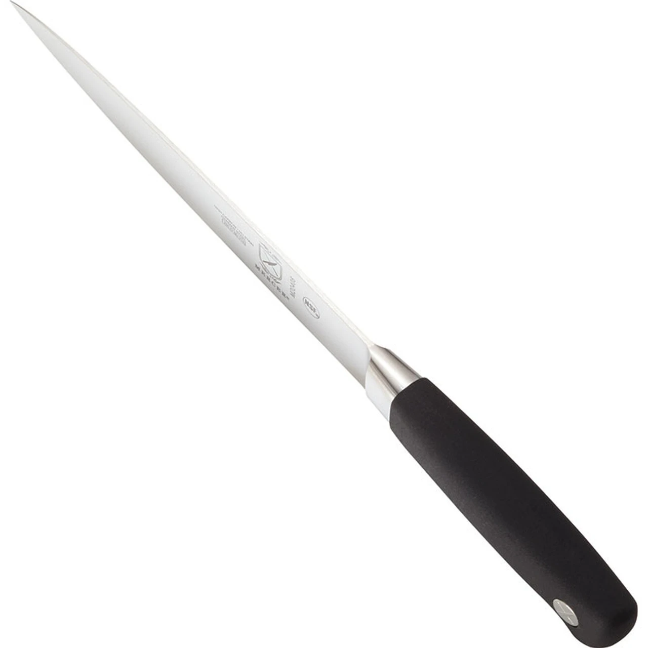 This knife’s high carbon, traditional German no-stain steel blade, features hand-polished edges that are taper ground for superior stability, easy-honing, and long-lasting sharpness. The high-carbon German cutlery steel resists rust, corrosion and discoloration. The Santoprene handle will not break down when exposed to kitchen oils and is able to withstand hot and cold temperatures. This knife’s long blade is perfect for slicing and carving poultry, roasts, and ham.