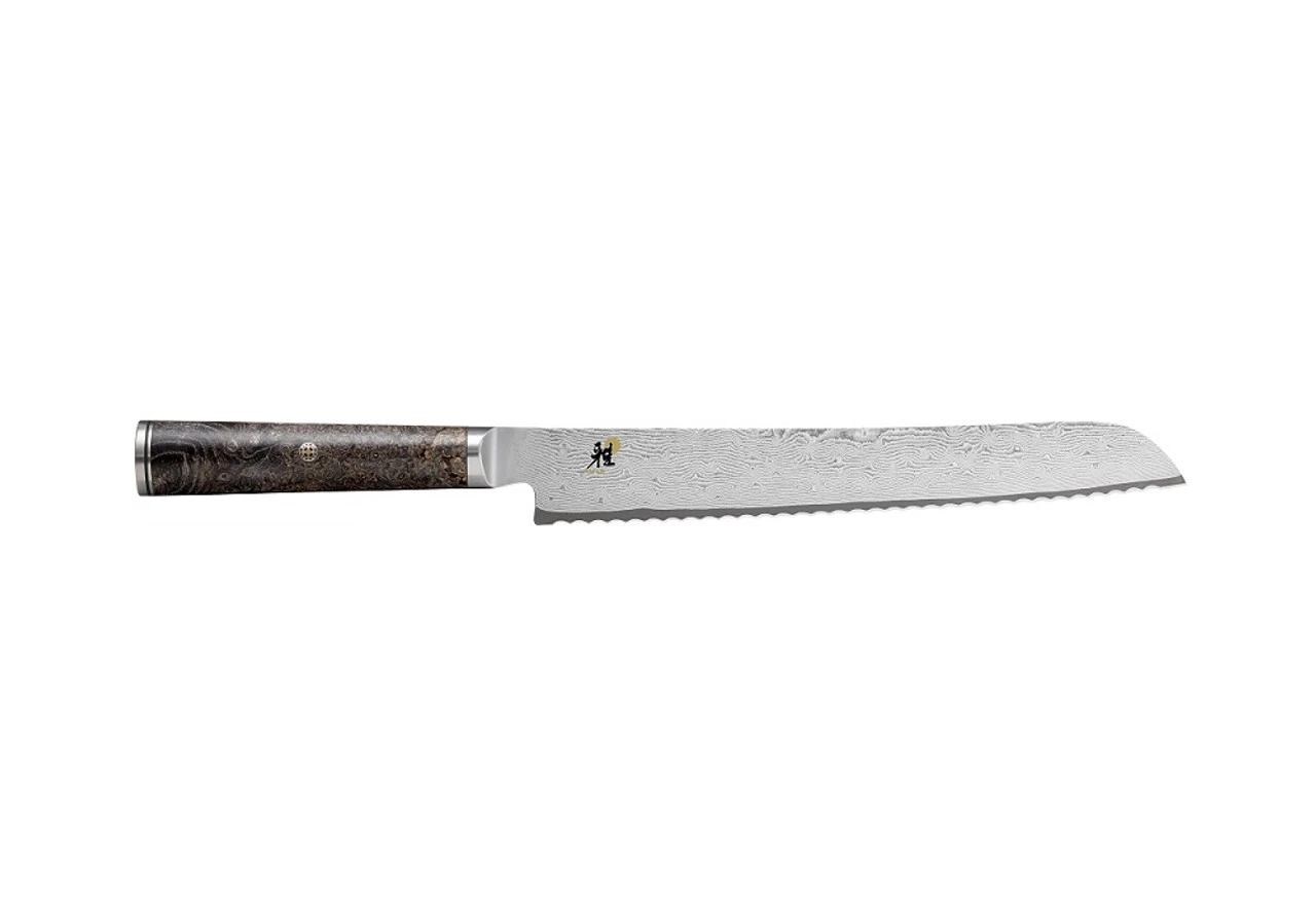 - Traditional Japanese D-shape handle made of black ash wood, elegantly enhanced with a mosaic pin, red spacers and a metal end cap featuring the MIYABI logo