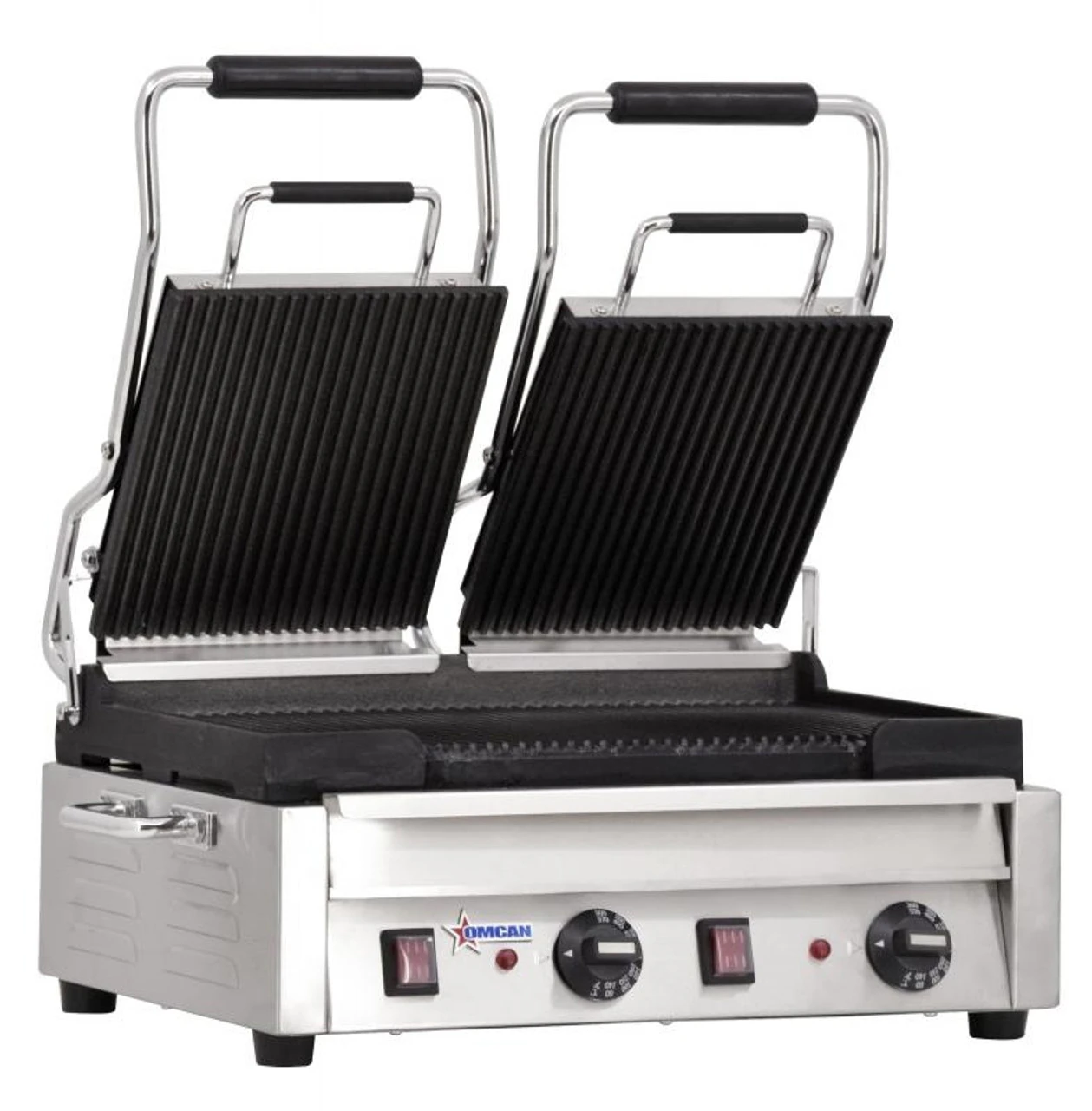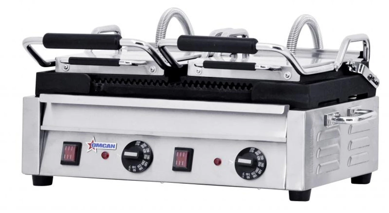 The grill is ideal for panini, foccacia, and pita sandwiches. It has a stainless steel body with cast iron grilling surfaces for easy cleaning. The grooved surface on the grills provides grill marks to the meat or sandwich making it more visually appealing for your customers.