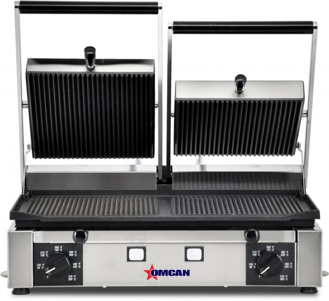 Elevate your sandwich making with Omcan’s Elite Series Double Panini Grill (11378), featuring a versatile 10″ x 19″ cooking surface with a grooved top and bottom. Ideal for crafting delicious quesadillas, panini, focaccia, and pita sandwiches, this grill is a must-have for any high-volume operation. Constructed from durable stainless steel with cast iron grilling plates, it ensures easy cleaning and long-lasting use. Experience precise cooking with its thermostat control and stay informed with the functioning pilot lamp. Safety is enhanced with non-slip rubber feet, while the included collecting tray simplifies cleanup. Proudly made in Italy, this sandwich grill comes with a 1-year warranty, ensuring your investment is protected. Perfect for restaurants, cafes, and any food service establishment looking to impress with perfectly grilled sandwiches.