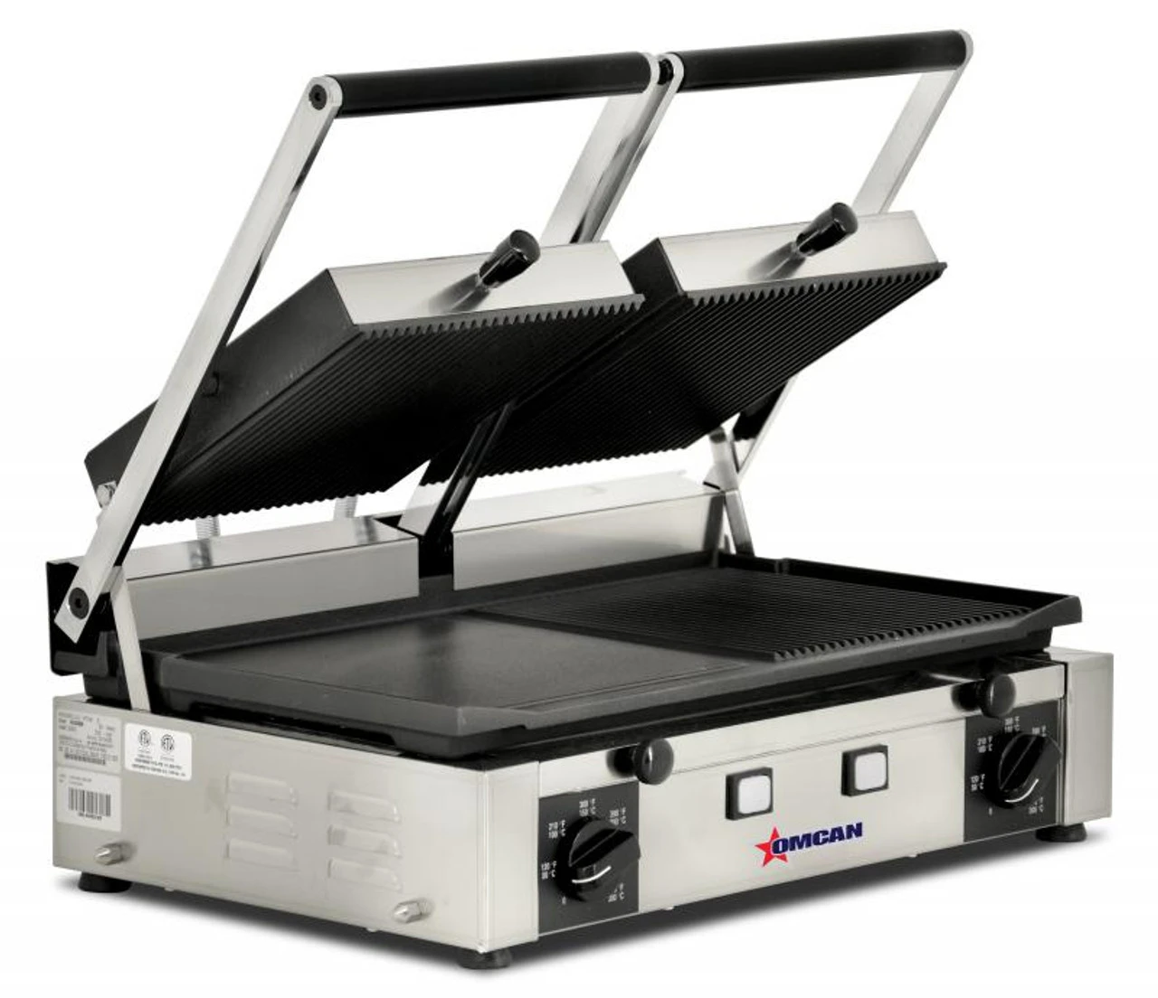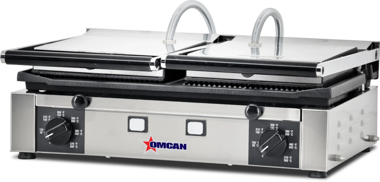 Elevate your sandwich making with Omcan’s Elite Series Double Panini Grill (11380), featuring a versatile 10″ x 19″ cooking surface with a ribbed top and a unique half grooved, half smooth bottom. Ideal for crafting delicious quesadillas, panini, focaccia, and pita sandwiches, this grill is a must-have for any high-volume operation. Constructed from durable stainless steel with cast iron grilling plates, it ensures easy cleaning and long-lasting use. Experience precise cooking with its thermostat control and stay informed with the functioning pilot lamp. Safety is enhanced with non-slip rubber feet, while the included collecting tray simplifies cleanup. Proudly made in Italy, this sandwich grill comes with a 1-year warranty, ensuring your investment is protected. Perfect for restaurants, cafes, and any food service establishment looking to impress with perfectly grilled sandwiches.