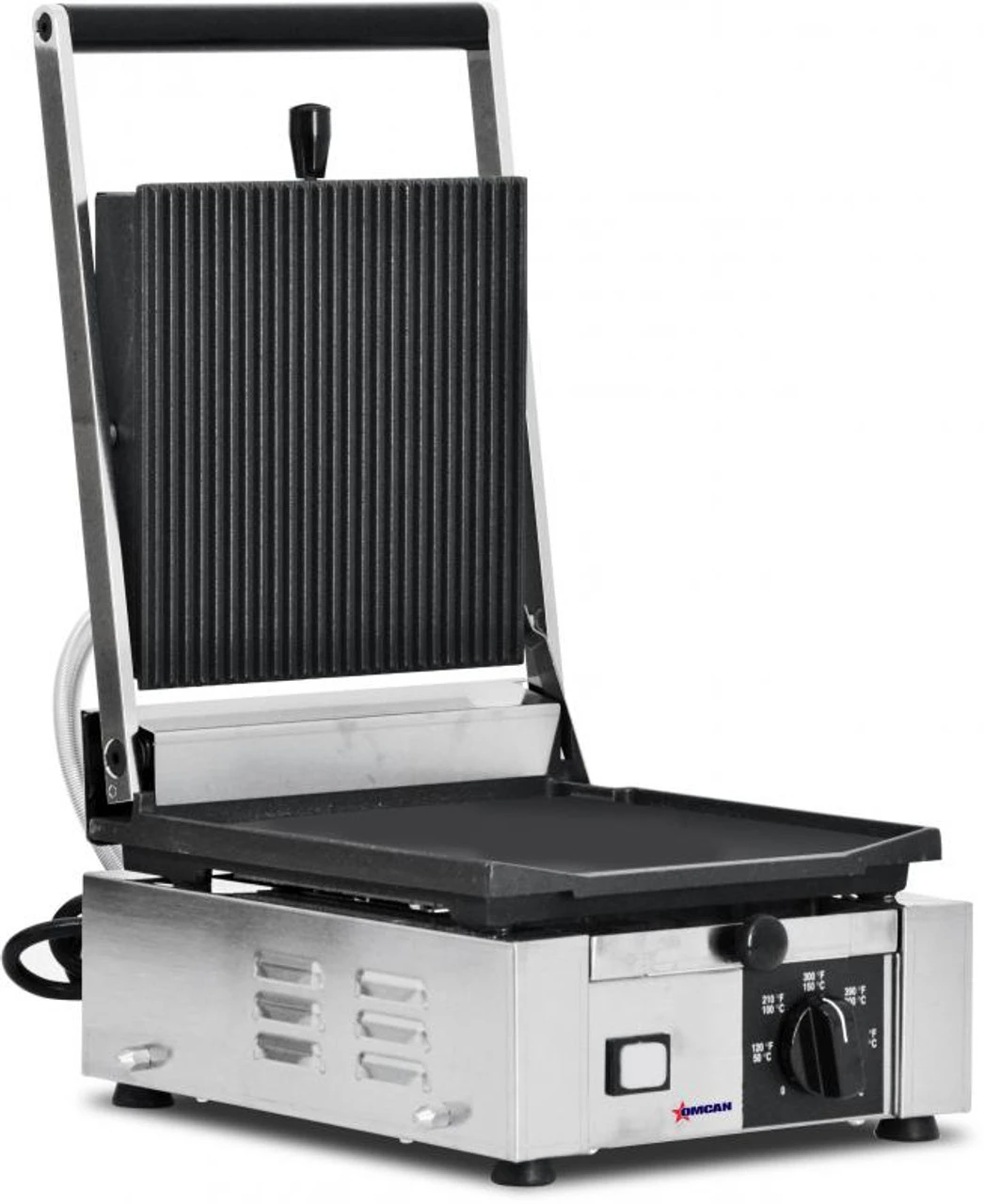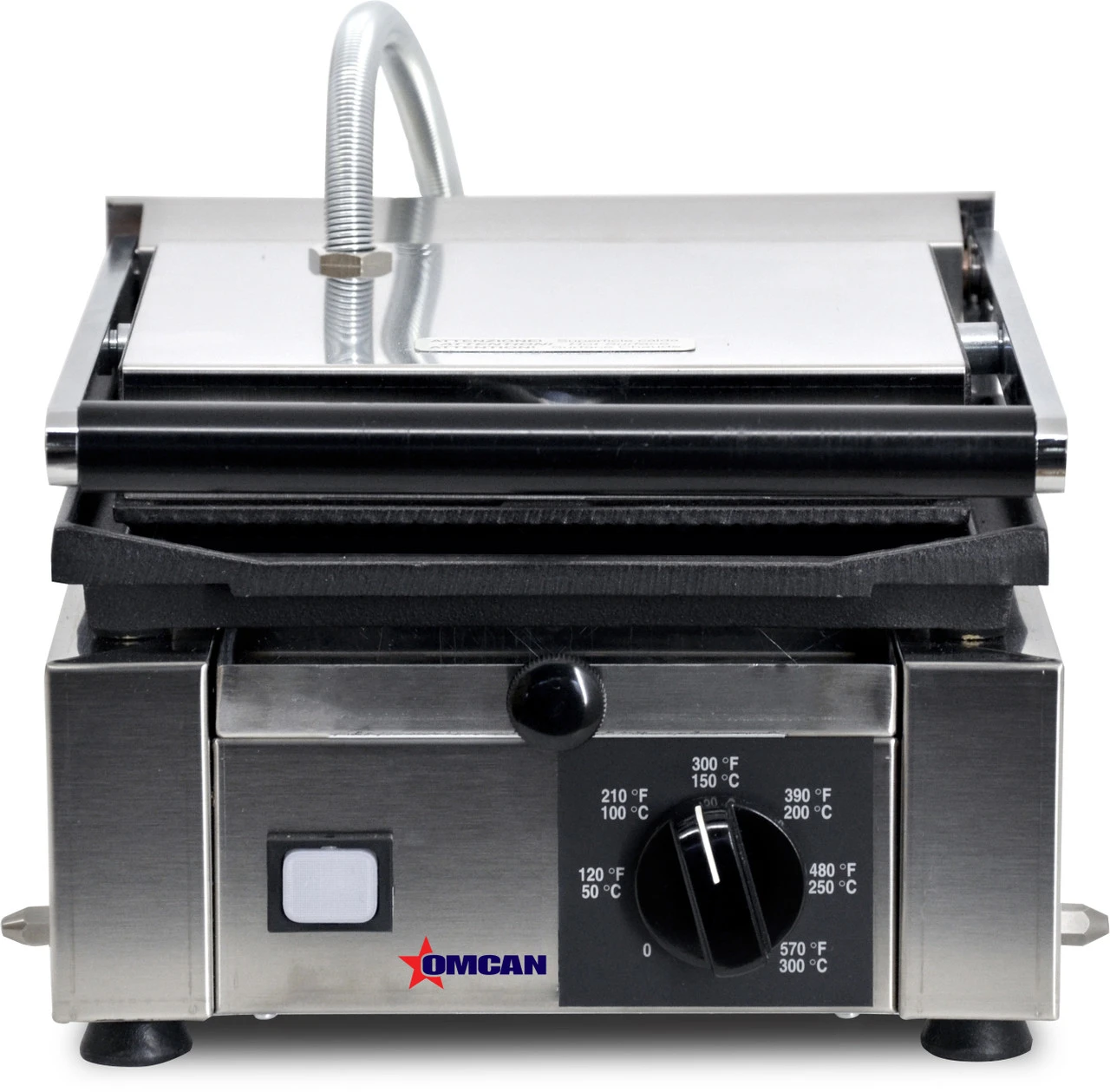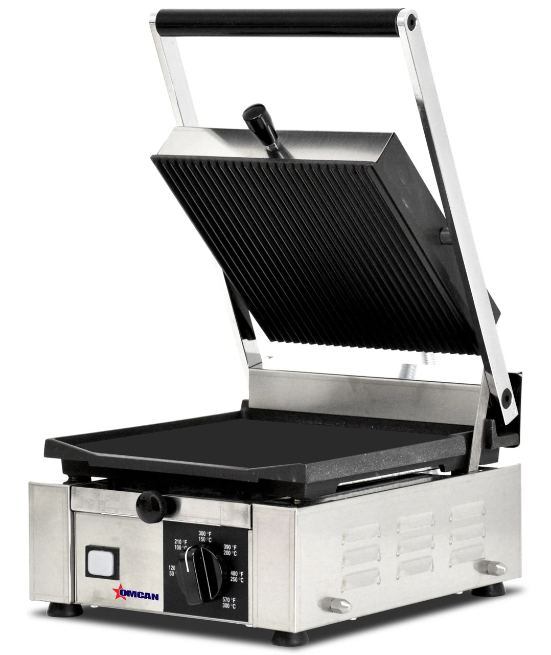 Elevate your sandwich making with Omcan’s Elite Series Single Panini Grill (11376), featuring a versatile 10″ x 9″ cooking surface with a grooved top and smooth bottom.
