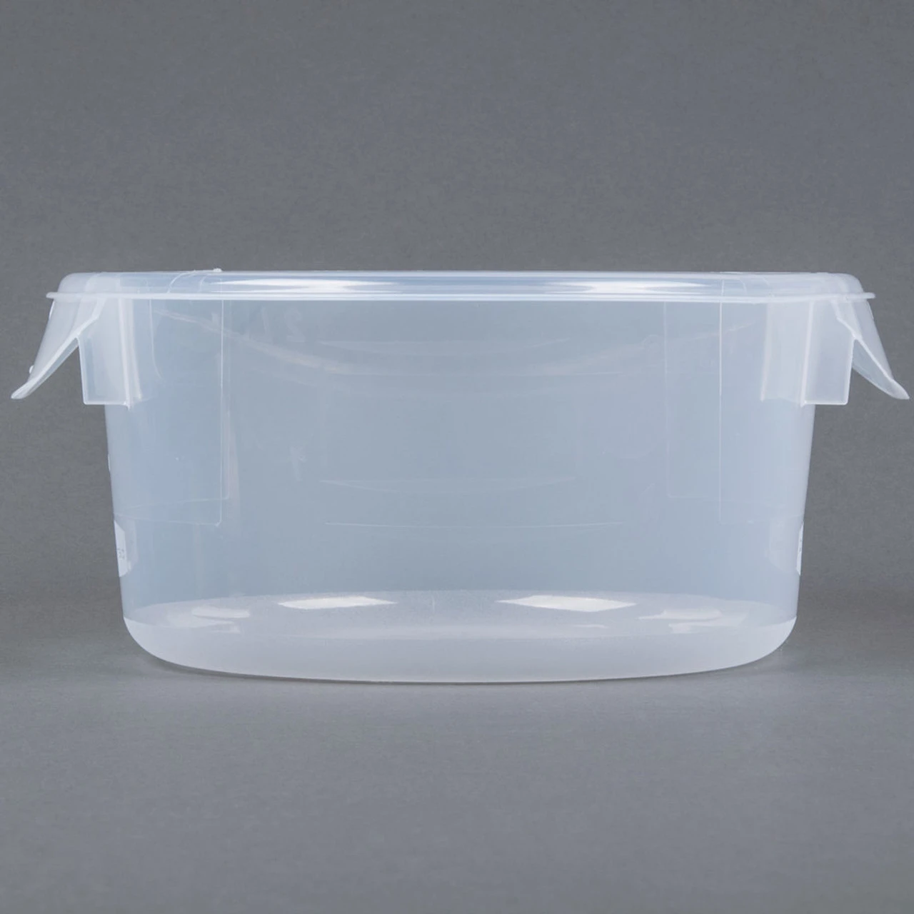 This Rubbermaid 5720-24 2 qt. round food storage container is a convenient, durable, and efficient solution for food storage. Its semi clear, strong polypropylene material allows for greater product visibility, and its smooth, round shape allows for easy cleaning. BPA free and made of FDA compliant materials, this food storage container is dishwasher safe and able to withstand temperatures from -20 to 212 degrees Fahrenheit. Providing compact storage for your busy kitchen, it is stackable with a reinforced rim for added strength and features ergonomic, easy-grip handles.This container also features precise measurement gradations. NSF Listed.