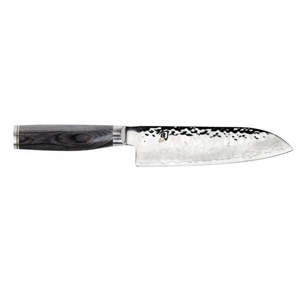 The Shun Premier Grey 7-in. Santoku is a beautiful, Asian-inspired chef’s knife. This knife has many talents and easily handles all the basic kitchen cutting tasks. This beautiful santoku features Premier’s razor-sharp blade with hammered finish and our sophisticated, new grey Pakkawood handle. Slightly shorter than the standard chef’s knife, the santoku is light, agile, and very easy to maneuver. We added just enough belly curve to enable quick, rocking cuts, too. As easy to use as a chef’s knife, this beautiful santoku will be your new go-to knife.