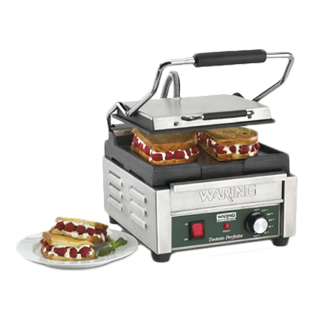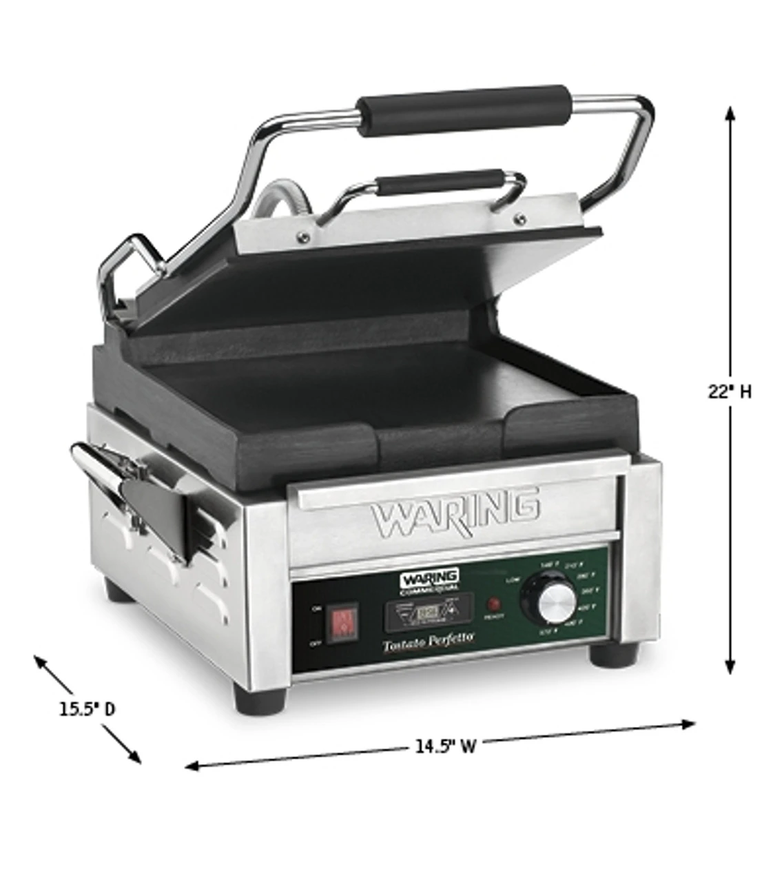 Flat cast-iron plates heat evenly and quickly grill sandwiches, burgers, chicken and vegetables up to 3″ thick. The brushed stainless steel body and removable drip tray are easy to clean. Includes adjustable thermostat to 570°F plus power ON and READY indicator lights, and a timer.