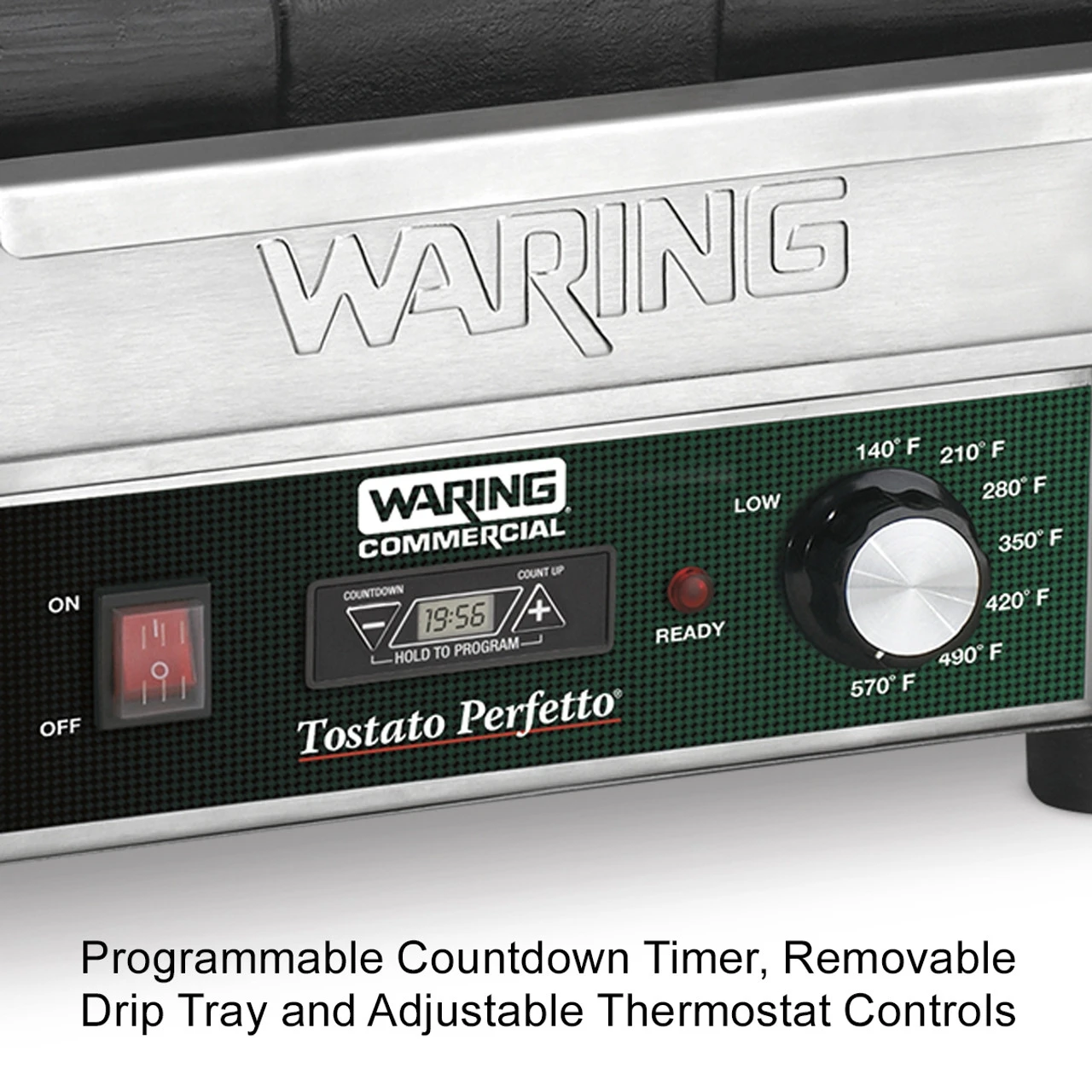 - Adjustable thermostat to 570°F, and power ON and READY indicator lights, plus timer