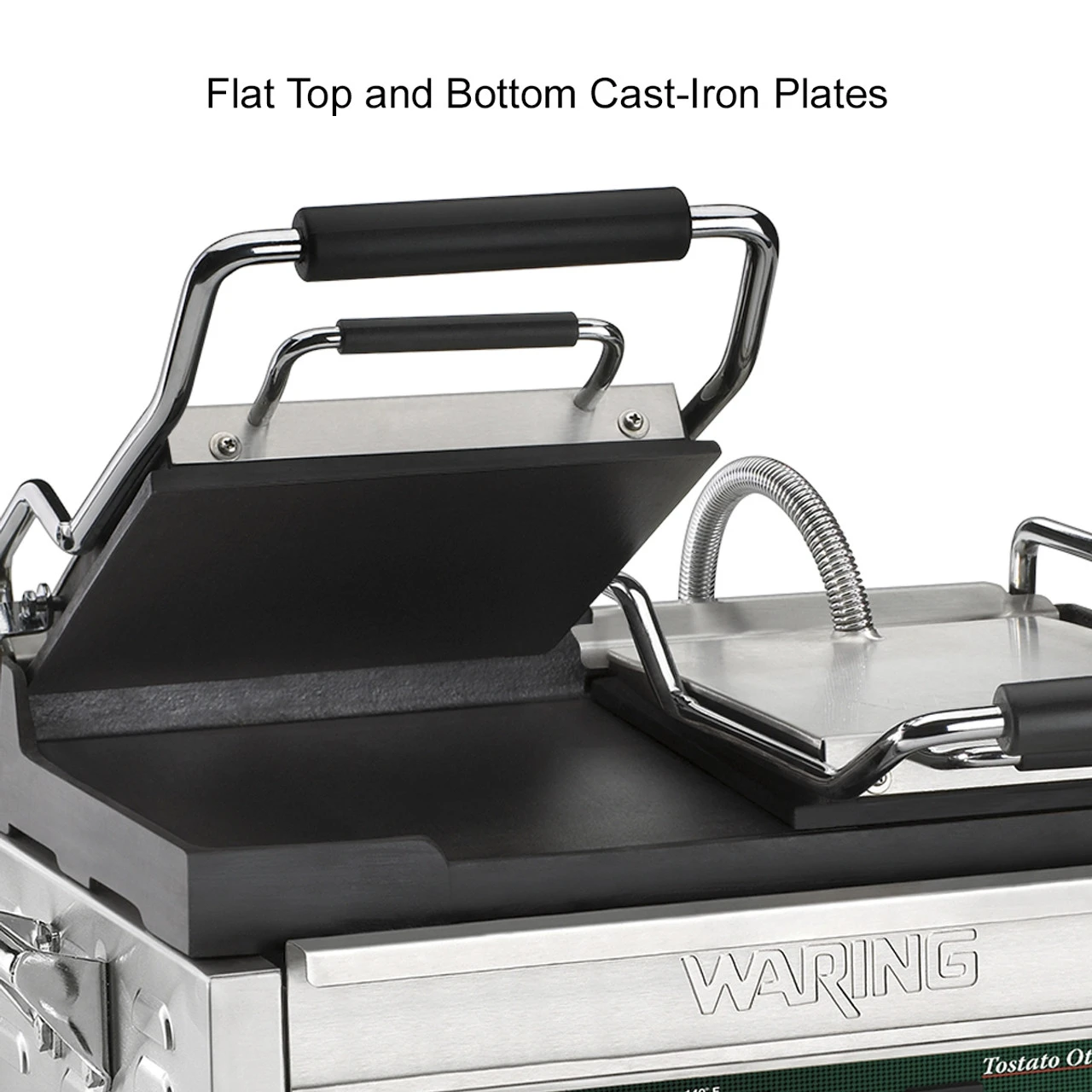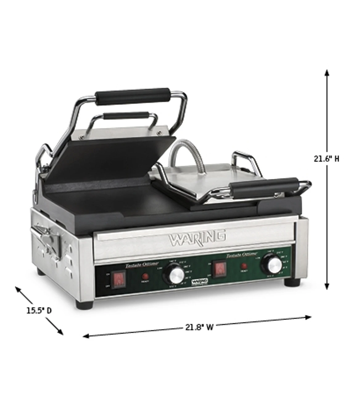 Flat cast-iron plates heat evenly and quickly to cook sandwiches, burgers, chicken, and vegetables up to 3” thick. The brushed stainless steel body and removable drip tray are easy to clean. Includes adjustable thermostat to 570ºF plus POWER and READY indicator lights.