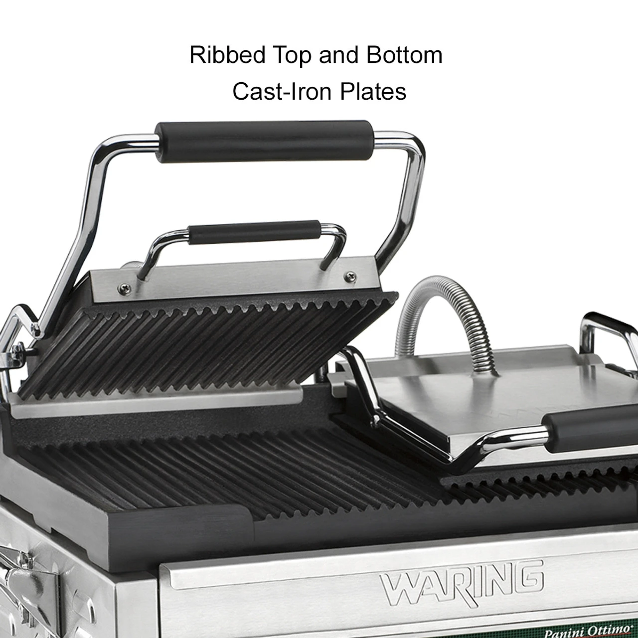 Grooved cast-iron plates heat evenly and quickly cook sandwiches, burgers, chicken, and vegetables up to 3″ thick. Its brushed stainless steel body and removable drip tray are easy to clean. Includes dual POWER and READY indicator lights.