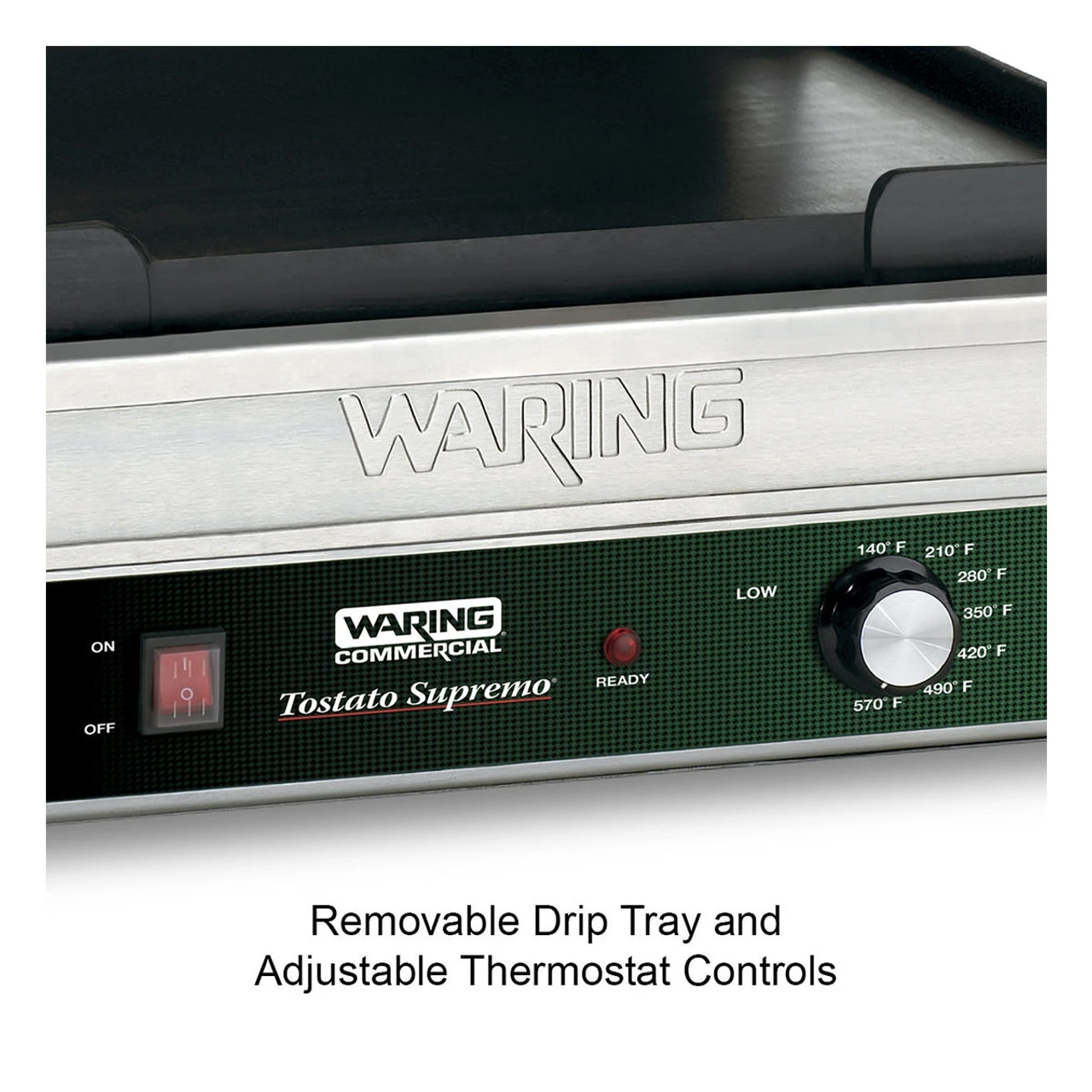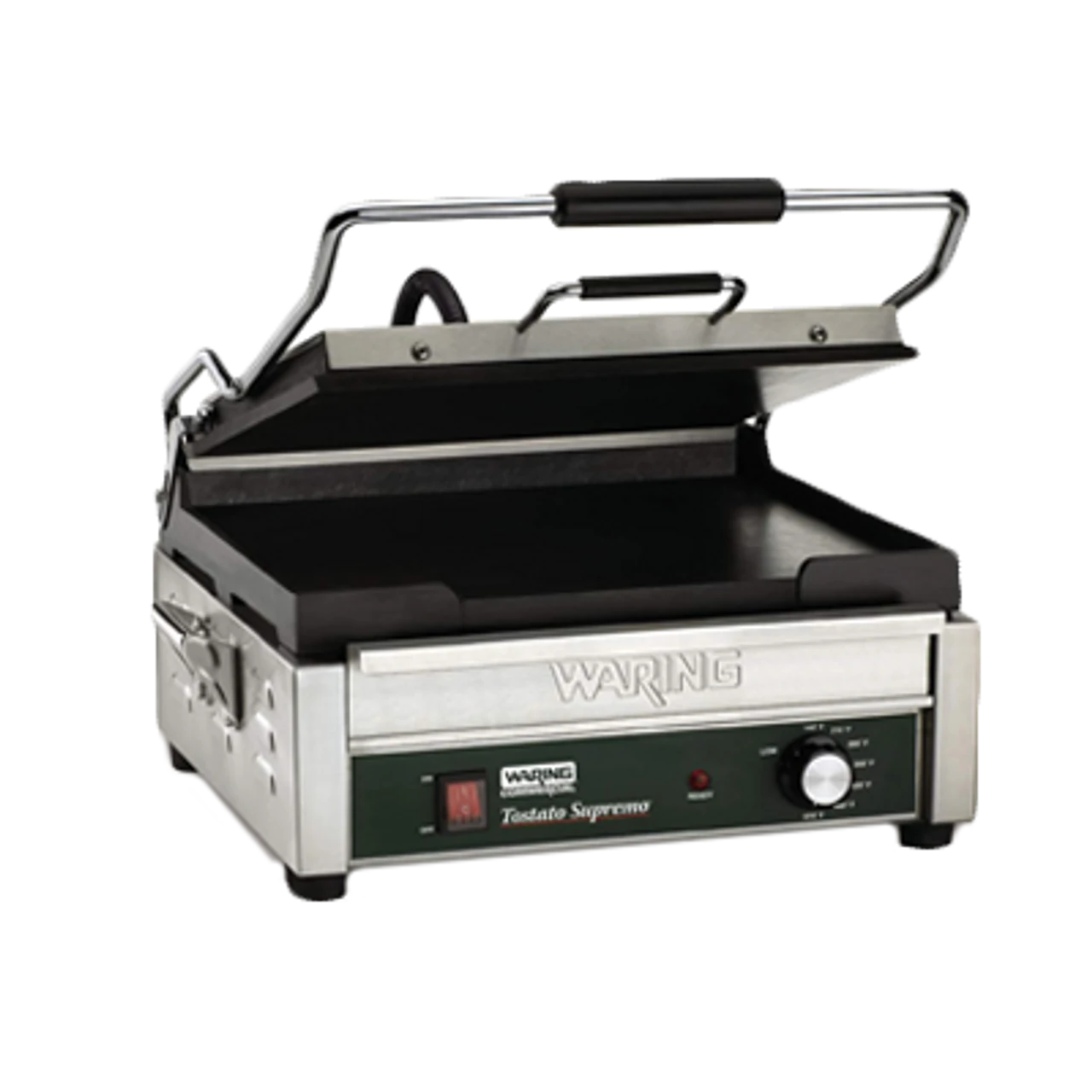 Flat cast-iron plates heat evenly and quickly to cook sandwiches, burgers, chicken, and vegetables up to 3″ thick. Its brushed stainless steel body and removable drip tray are easy to clean. Includes POWER and READY indicator lights.