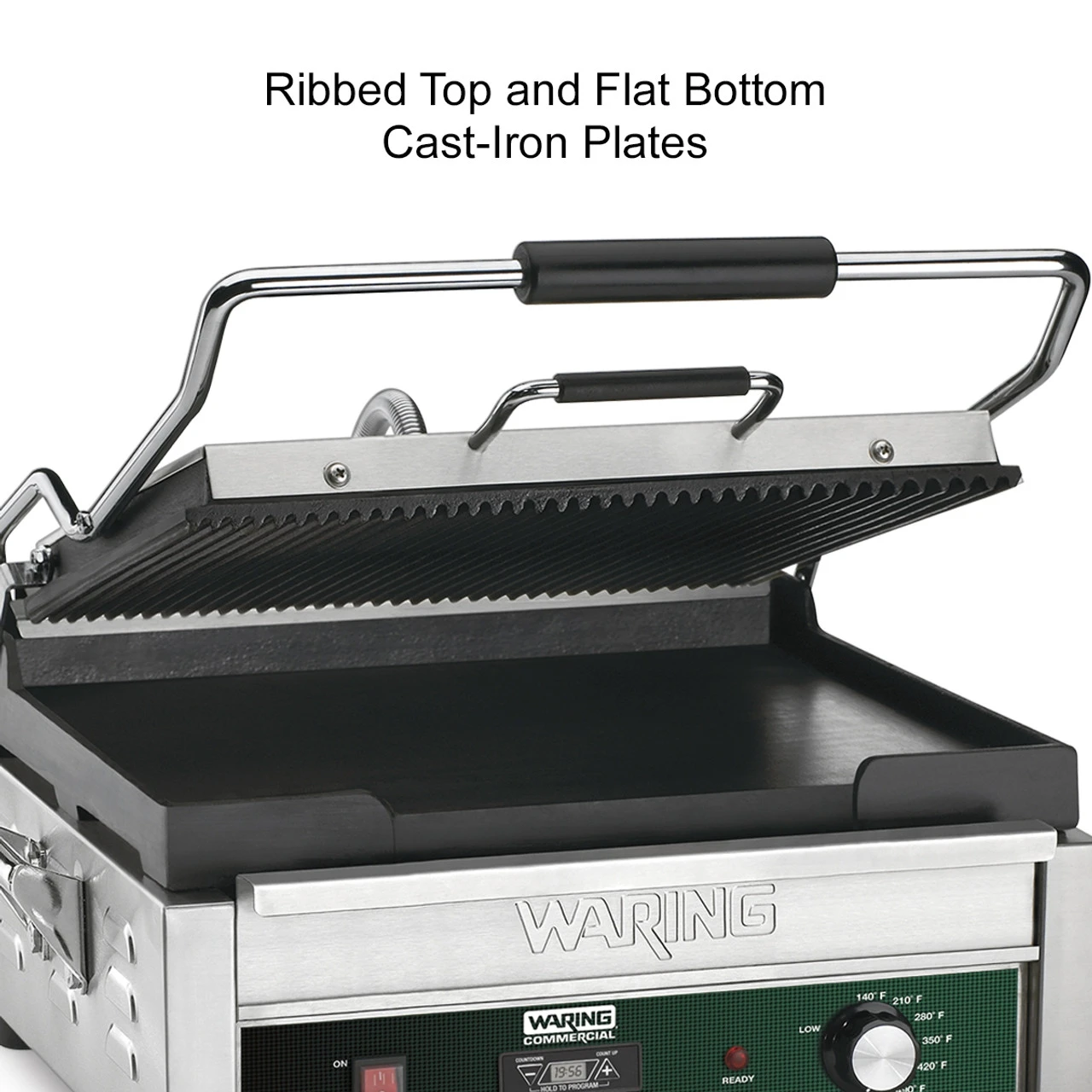 The grooved cast-iron plate on top and flat plate on the bottom heat evenly and quickly to grill foods up to 3″ thick. Its brushed stainless steel body and removable drip tray are easy to clean. Includes power ON and READY indicator lights, and timer.