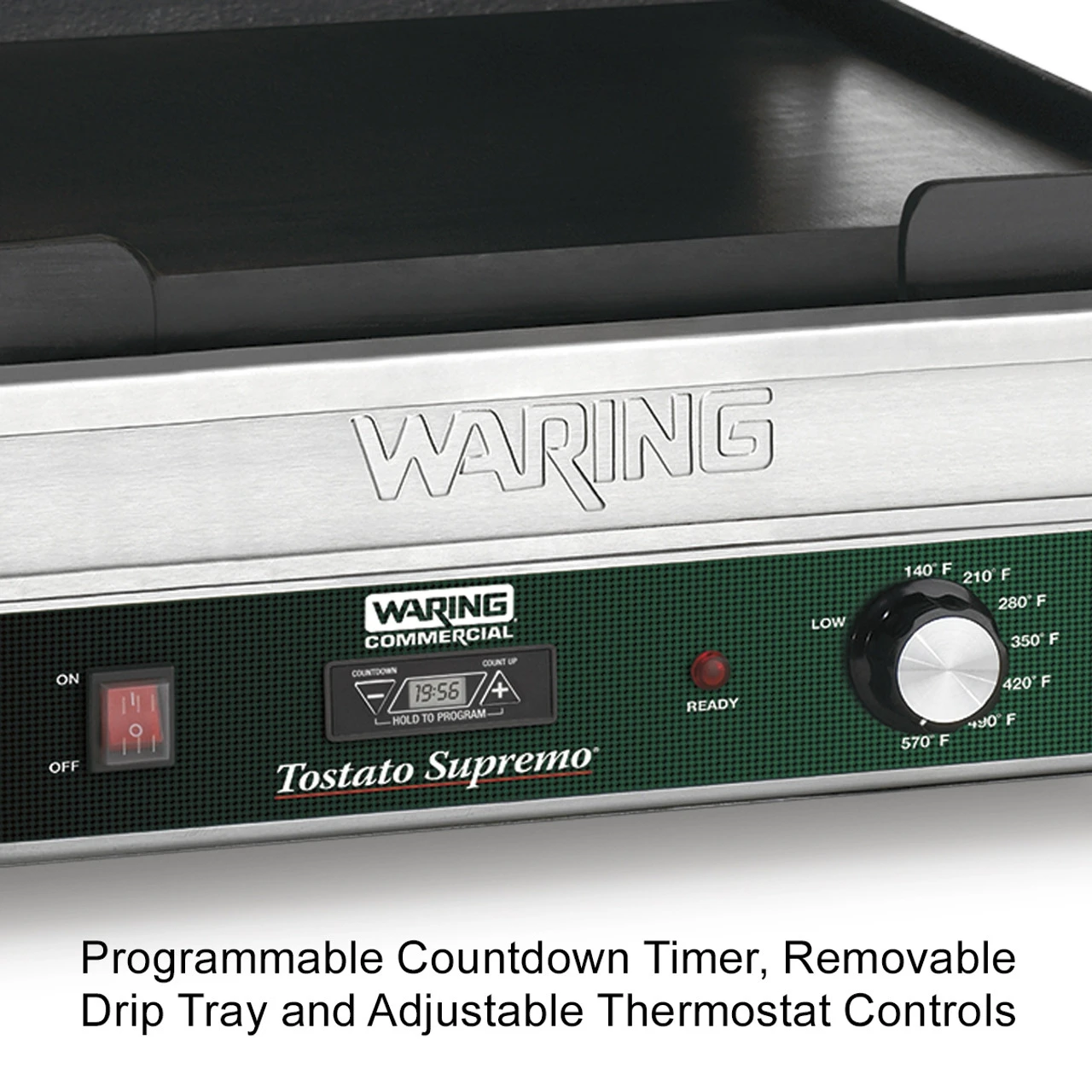 - Adjustable thermostat to 570° and power ON and READY indicator lights, and timer.