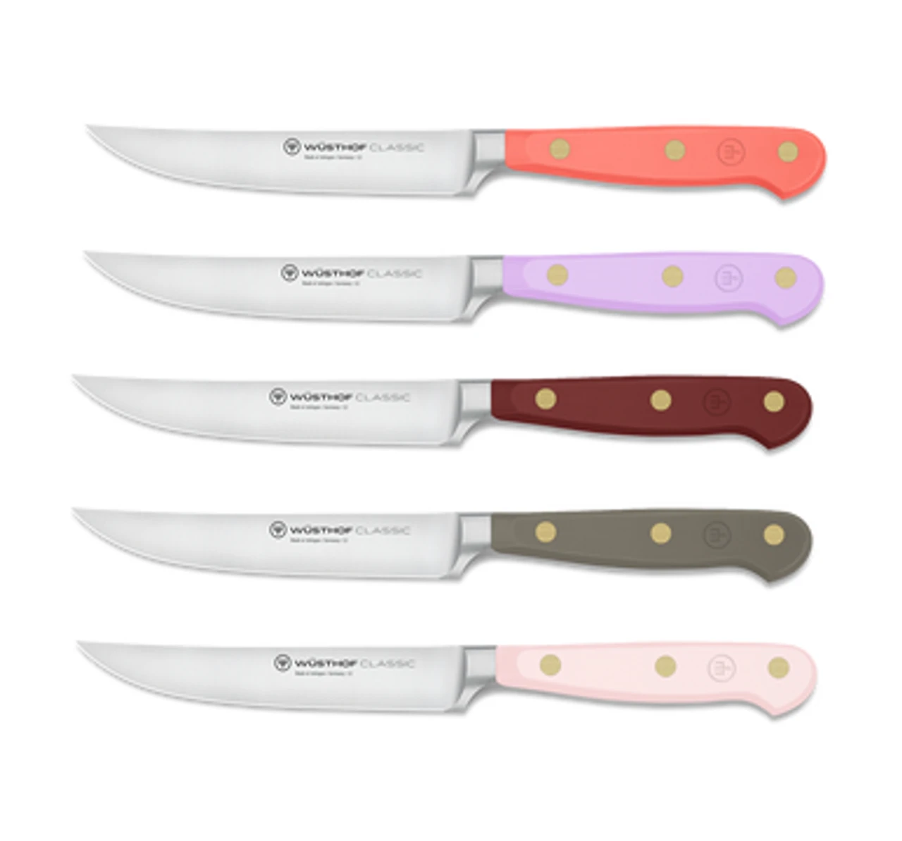 YOUR CHOICE OF COLOUR – PACK INCLUDES: 1 CORAL PEACH, 1 PURPLE YAM, 1 TASTY SUMAC, 1 VELVET OYSTER, 1 PINK HIMLAYAN STEAK KNIFE