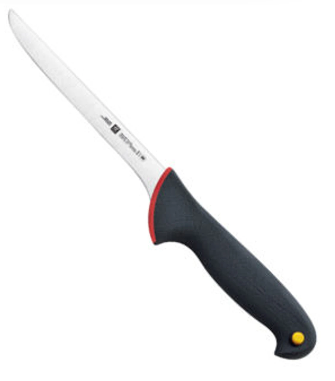The ingenious 6 colour ID button system easily identifies a knife to prevent cross-contamination during food preparation; ideal for the conscientious Chef. These precision stamped, finely honed, high performance “NO STAIN” stainless steel blades combined with ergonomic safe-grip handles make ZWILLING KolorID the perfect knife for the commercial kitchen. The ZWILLING KolorID 6″ boning knife features a long, slim, thin and flexible blade designed for cutting meat off the bone as well as for separating and skinning meat, poultry or fish.