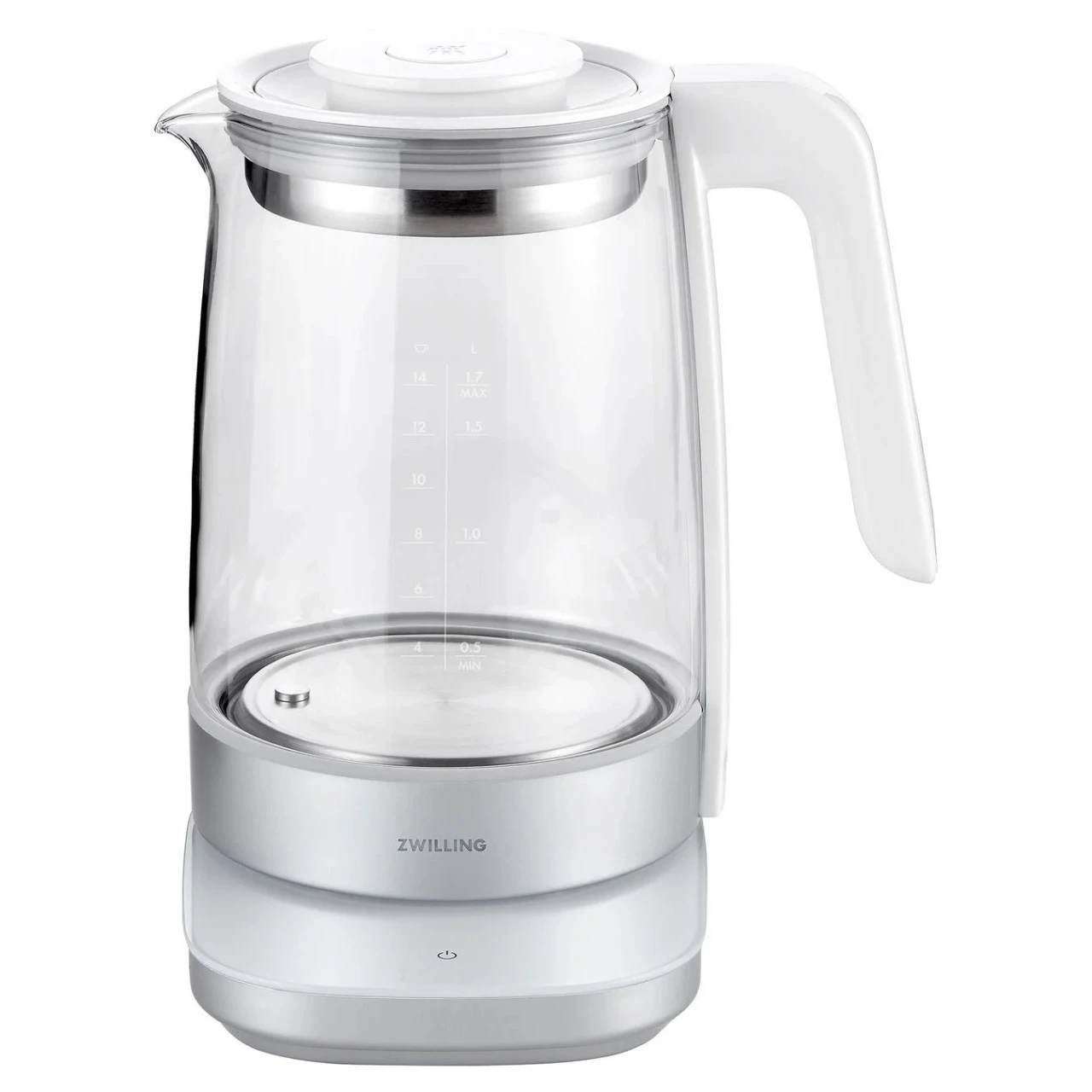 Tea maker in elegant design: the ZWILLING Enfinigy electric kettle in silver. Tea preparation starts with the temperature selection on the 360° base station. Thanks to the pre-boil function, the glass electric kettle can heat the water to 212 °F first, and then reports when the selected temperature has been reached. Now simply fill your tea directly into the stainless steel tea insert. The built-in tea timer lets you know that the tea is ready with an acoustic signal. You can choose a cooking time between 0 and 10 minutes, adapted to the tea variety. The tea insert can then be removed using the built-in holder in the lid, loosened at the push of a button and placed on the drip tray provided. If the well-deserved tea break has to be put on hold for a moment, the electric kettle can simply keep the tea at the desired temperature for 30 minutes using the keep-warm function. The glass electric kettle has a capacity of 1.7 litres and has other uses in addition to its function as a tea maker. A baby food insert is available specifically for preparing baby food and keeping it warm, which can also be used to sterilise dummies and bottles at 212 °F for 5 minutes. The modern glass electric kettle is also easy to clean.