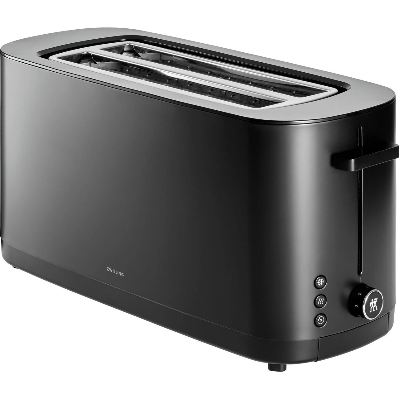 Enjoy your toast precisely how you like it. Every time. The premium toaster for two slices in modern ZWILLING design always ensures evenly brown toast even over repeated toasting. It does so by automatically shortening the toasting duration to achieve the desired browning. The 1000 watt toaster’s four separate heating elements evenly toast both sides of every slice. The result is crispy on the outside and soft on the inside – authentic ZWILLING toast. When it’s finished, toast doesn’t fly out of the toaster. The soft-lift feature ensures they gently glide up and the built-in extra-lift feature allows even smaller slices to be removed easily from the toaster. Never burn your toast again: This toaster automatically switches off when the preset toasting duration is reached. Even when set to high, toast is never toasted to more than dark brown. The stop button also allows you to instantly stop toasting at any time. Crumbs fall into the easy-to-remove crumb tray. The toaster features seven browning levels as well as three automatic programmes. The warm up feature allows you to reheat cold toast. The thaw feature allows you to toast frozen bread direct from the freezer. And the bagel feature with slice centring allows you to achieve ideal bagel toasting results: crispy on the outside, toasted on the inside.