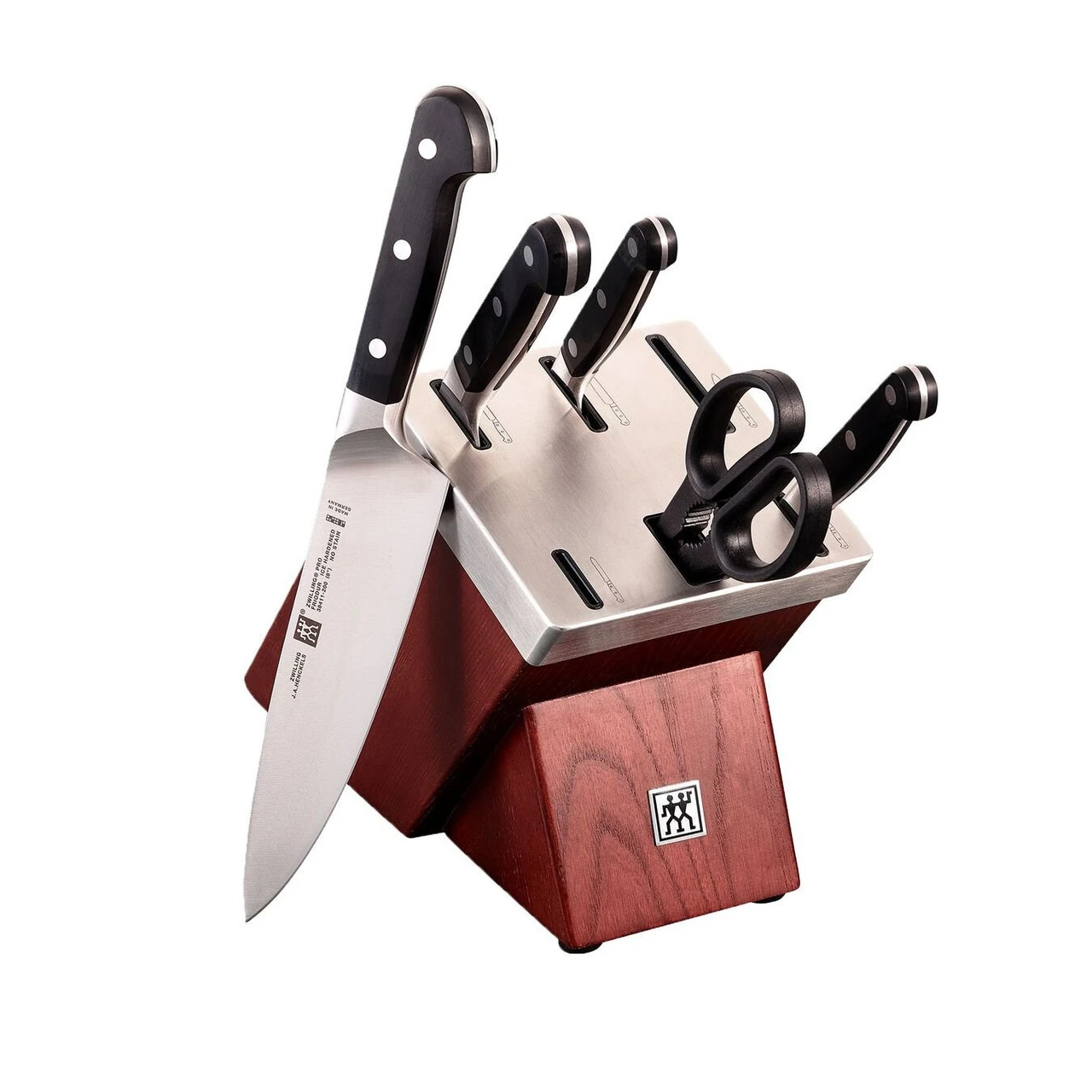 - Set Contents: 4″ Paring, 6″ Utility, 8″ Bread, 8″ Chef, Kitchen Shears, 6 Slot Self Sharpening Block